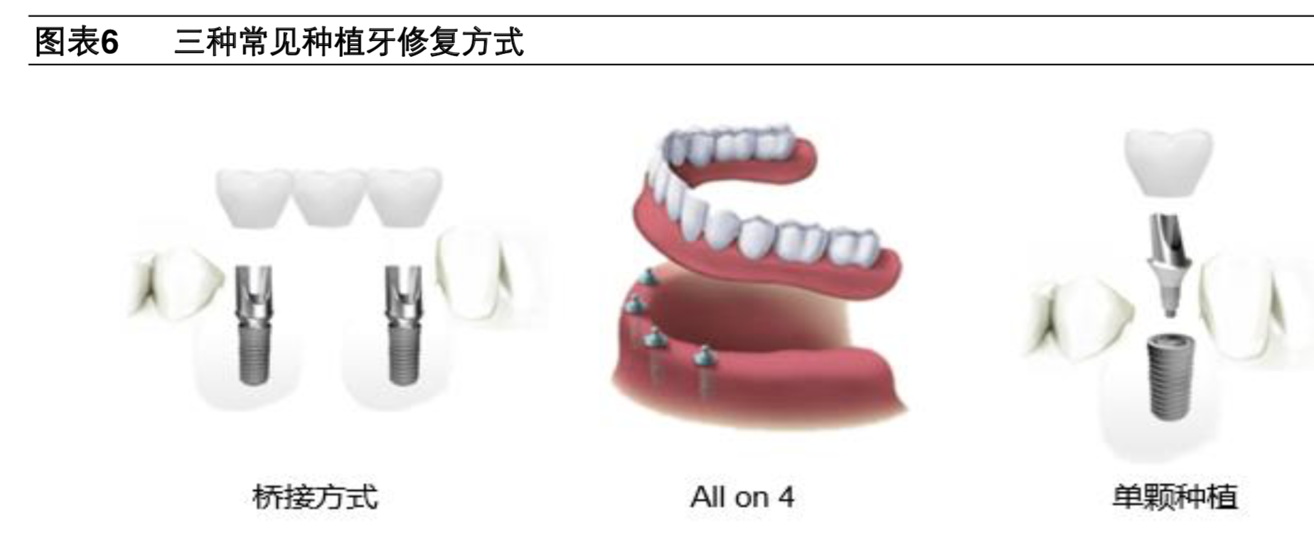 通常,種植牙系統(tǒng)由種植體、種植基臺(tái)和牙冠組成,種植體是核心,以“骨結(jié)合”的方式固定在牙 頜骨上,充當(dāng)人工牙根,再通過(guò)基臺(tái)與上部的牙冠連接,從而行使功能。一般種植牙分為單顆植入、 橋接植入和 All on 4 全口無(wú)牙頜植入三種。