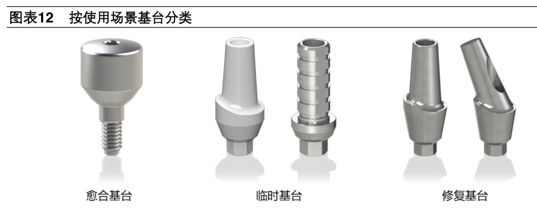 愈合基臺(tái)和臨時(shí)基臺(tái)為終修復(fù)做準(zhǔn)備。在兩段式種植系統(tǒng)中,基臺(tái)與種植體分離,種類繁多。根 據(jù)使用場(chǎng)景,基臺(tái)大體分為愈合基臺(tái)、臨時(shí)基臺(tái)和修復(fù)基臺(tái)。其中愈合基臺(tái)的主要作用是為修復(fù)基 臺(tái)準(zhǔn)備位點(diǎn)并在種植體周圍形成組織袖口。愈合基臺(tái)的選擇主要取決于軟組織的厚度;臨時(shí)基臺(tái)則 是用于臨時(shí)義齒的固定,有利于形成齦溝和牙間乳頭;修復(fù)基臺(tái)是通過(guò)連接種植體來(lái)支持或固位修 復(fù)體,用于恢復(fù)牙列缺失。與修復(fù)基臺(tái)相比,臨時(shí)基臺(tái)更多使用聚醚醚酮(PEEK)材料,易于椅旁 調(diào)改,且成本較低。