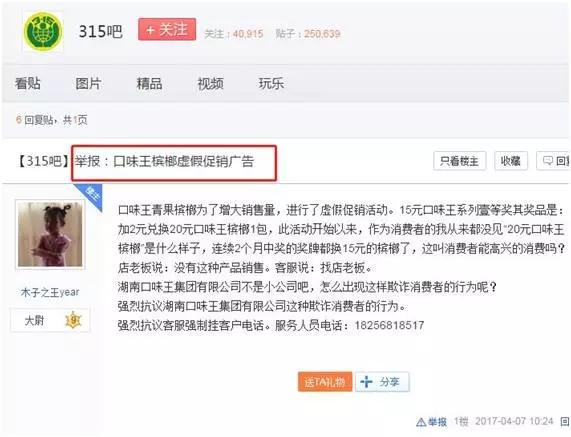 記者注意到,2017年,有網(wǎng)友在百度“315”貼吧里舉報口味王做虛假促銷廣告,舉報內(nèi)容稱:“口味王青果檳榔為了增大銷售量,進行了虛假促銷活動。15元口味王系列壹等獎其獎品是:加2元兌換20元口味王檳榔1包,活動開始以來,我從來沒見‘20元口味王檳榔’是什么樣子,連續(xù)2個月中獎的獎牌都換15元的檳榔了,這能叫消費者高興嗎?”該網(wǎng)友還質(zhì)問,身為大企業(yè),口味王怎么出現(xiàn)欺詐消費者的行為?