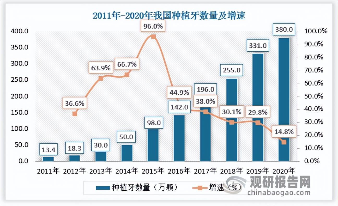 數(shù)據(jù)顯示,2011年-2020年我國(guó)種植牙數(shù)量由13.4萬顆達(dá)到380.0萬顆,2020年市場(chǎng)規(guī)模達(dá)240億元,占口腔市場(chǎng)的25%。