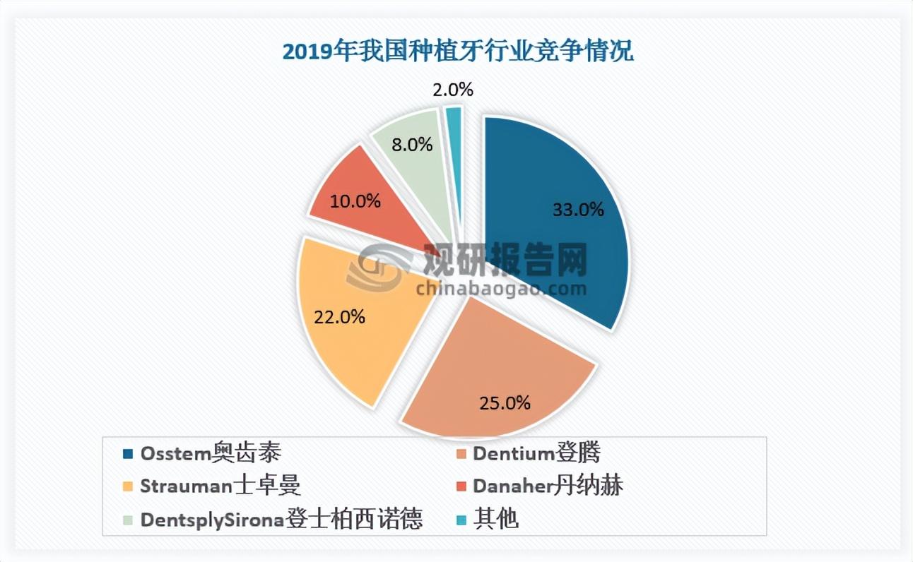 從市場(chǎng)競(jìng)爭(zhēng)方面來看,國(guó)產(chǎn)種植體由于起步晚,雖然近年來在表面處理工藝和產(chǎn)品加工精密度方面已經(jīng)逐步成熟,但在臨床數(shù)據(jù)支撐和學(xué)術(shù)支持上有所欠缺,因此國(guó)內(nèi)種植體市場(chǎng)仍以外資品牌占據(jù)主導(dǎo)地位。據(jù)數(shù)據(jù),2019年韓國(guó)Osstem奧齒泰占據(jù)我國(guó)種植牙33%的市場(chǎng)份額;第二為Dentium登騰,市占率為25%。市占率第三的為瑞士品牌Strauman士卓曼22%,第四為美國(guó)丹納赫Danaher(收購(gòu)Nobel)10%;第五為DentsplySirona登士柏西諾德8%。我國(guó)種植牙主要市場(chǎng)被外資品牌所瓜分,未來隨著國(guó)內(nèi)多省落地種植體集采,種植牙手術(shù)的整體收費(fèi)有望進(jìn)一步下降,將驅(qū)動(dòng)國(guó)產(chǎn)品牌滲透率加速提升。