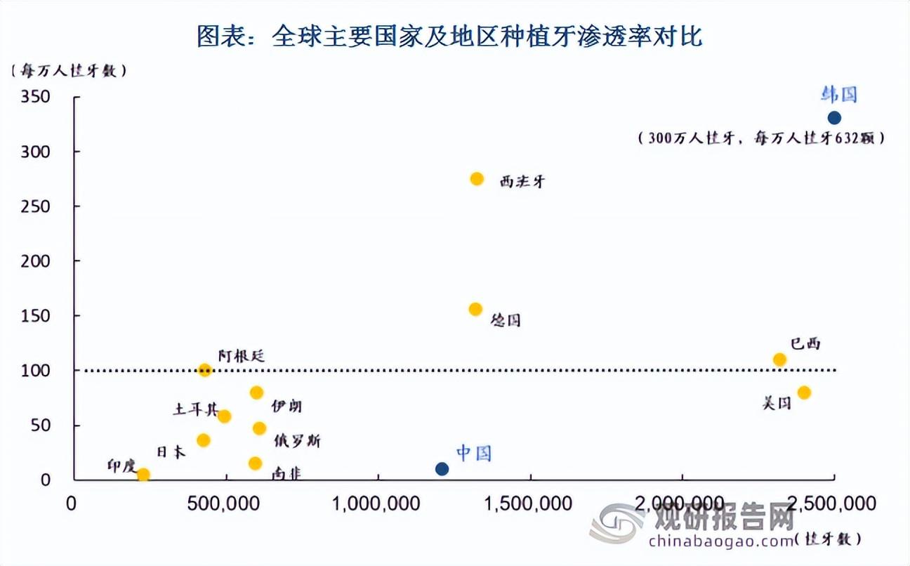 對(duì)標(biāo)海外,韓國(guó)的種植牙因?yàn)榧{入醫(yī)保滲透率上升迅猛,達(dá)到每萬人632顆,為高。滲透率達(dá)到每萬人100顆以上的包括西班牙、德國(guó)、巴西、阿根廷,美國(guó)為接近100萬。相比之下我國(guó)種植牙滲透率很低,核心要素是支付可及性低。對(duì)比各國(guó)種植牙價(jià)格/GDP比例,韓國(guó)種植牙價(jià)格/GDP比例低,不到5%,考慮到醫(yī)保覆蓋,韓國(guó)個(gè)人實(shí)際支付比例更低;其次意大利、美國(guó)、英國(guó)、西班牙,以及新興市場(chǎng)土耳其、巴西和墨西哥等也較低,相應(yīng)的這些的種植牙滲透率較高。而我國(guó)的種植牙收費(fèi)與GDP比例接近20%,處于較高水平。今年以來國(guó)內(nèi)多地醫(yī)保局發(fā)布通知調(diào)查種植牙費(fèi)用,種植牙集采或加速推進(jìn),種植牙數(shù)量有望呈現(xiàn)爆發(fā)式增長(zhǎng)。