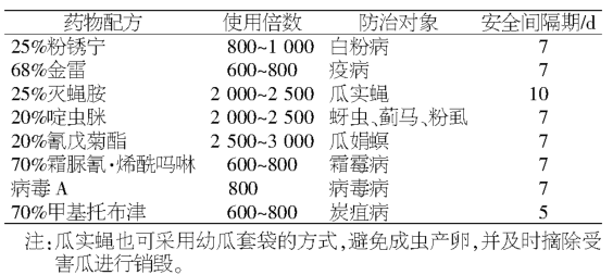 苦 瓜 主 要 病 蟲害有 白 粉 病 、 疫 病 、 霜 霉 病 、 瓜 實(shí) 蠅、 瓜 娟螟 、 蚜 蟲 等, 要 以 預(yù) 防 為 主 , 綜 合 治 理 , 綠 色 防 控 。 實(shí) 行3 年以 上 輪 作, 加 強(qiáng) 栽 培 管 理 , 深 溝 寬 畦 , 合 理 密 植 , 及 時(shí) 整 枝 打葉, 改 善 通 風(fēng) 透 光 條 件 , 使 植 株 生 長(zhǎng) 個(gè) 士 , 提 高 抗 病 能 力 , 增施 磷 肥 、 鉀 肥, 防 止 過 量 施 用 氮 肥 。 化 學(xué) 防 控 是 目 前 苦 瓜 病 蟲害 主 要 的 防 治 方 法 , 選 用 農(nóng) 藥 及 防 治 對(duì) 象 參 見 表1。