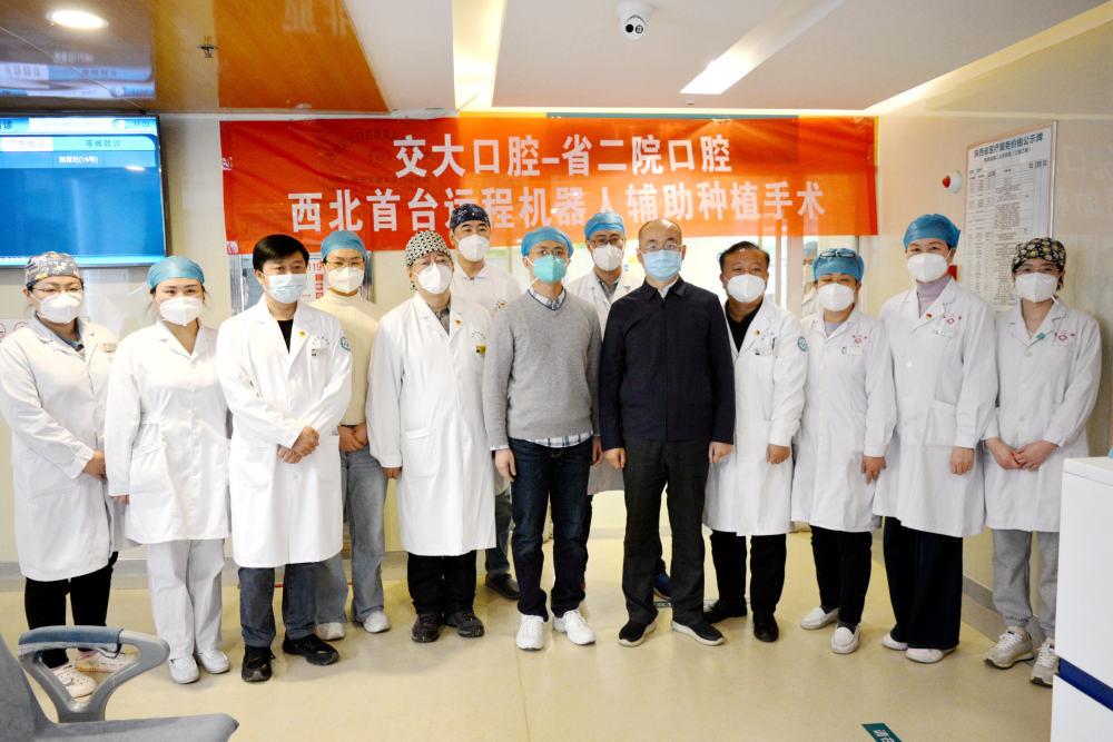 12月2日上午,西安交通大學口腔醫(yī)院和陜西省第二人民醫(yī)院通過網絡視頻直播,聯合會診共同實施了一例口腔手術機器人輔助下的種植體植入術,通過借助智能手術機器人設備定位鉆孔,專家視頻會診,順利圓滿的完成了修復手術。手術采用遠程會診系統(tǒng),由西安交通大學口腔醫(yī)院信息科孫輝主任牽頭提供視頻通訊技術支持,配合口腔專家完成會診。標志著交大口腔醫(yī)院種植進入“數智化”新階段,這也是西北首臺遠程機器人輔助種植手術。