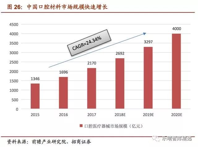 2015年我國的口腔醫(yī)療器械市場已達(dá)1346億元,據(jù)前瞻產(chǎn)業(yè)研究院預(yù)計(jì),到2020年相關(guān)領(lǐng)域產(chǎn)品及服務(wù)的市場規(guī)模將突破4000億元,CAGR達(dá)到24.34%。
