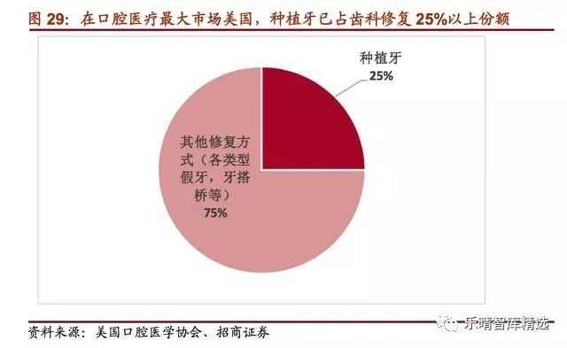 據(jù)美國口腔醫(yī)學(xué)會(huì)統(tǒng)計(jì),2017年美國共有約1500萬例牙搭橋修復(fù)或假牙植入,而同期內(nèi)種植牙植入量約為500萬顆,種植牙在整個(gè)齒科修復(fù)的占比約25%。