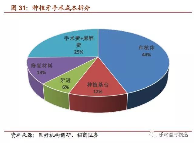 口腔修復(fù)材料在手術(shù)成本中的占比不大,如果均采用中值進(jìn)行測算,則目前一臺種植牙手術(shù)的費(fèi)用為15000元,其中包括6800元左右的種植體,1800元的基臺,2500元的牙冠,1500元的修復(fù)材料,其余2400元?jiǎng)t為手術(shù)及設(shè)備費(fèi)用。