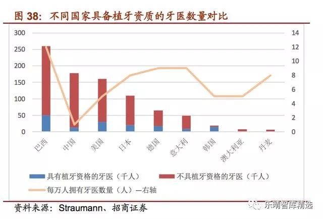 在韓國,有80%的牙醫(yī)有植入資格,在巴西,有植牙資格的牙醫(yī)數(shù)量是多。美國只有22%的牙醫(yī)有植牙資格,因此,美國和德國雖然人均可支配收入差距不大,但植牙滲透率的差距比較大。
