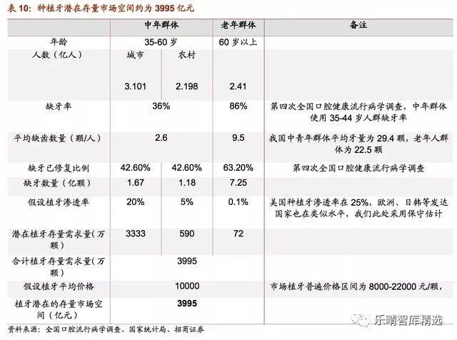 我們保守地估計(jì)城市中年缺牙群體的種植牙滲透率20%,農(nóng)村中年群體的滲透率5%,老年人群的滲透率0.1%,那么按照我國新的人口數(shù)據(jù),則種植牙市場的潛在存量需求數(shù)量約為4000萬顆,理論存量市場需求金額達(dá)到4000億元以上。