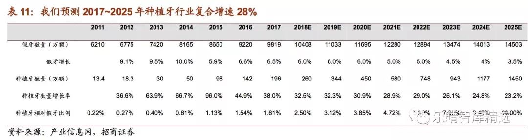 從2011年~2017年,植牙量復(fù)合增長了56%,我們估計(jì)2017年種植牙數(shù)量196萬顆左右,種植牙占假牙比例僅1.61%。我們假設(shè)到2025年,這一比例將提升到10%。預(yù)測數(shù)據(jù)如下表: