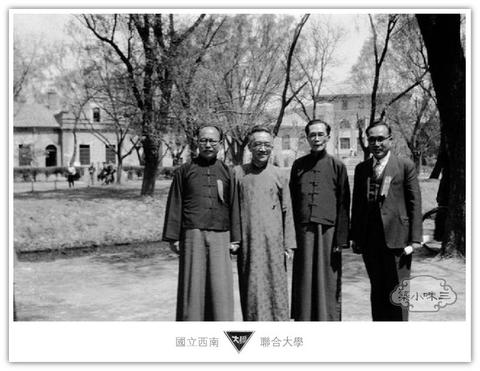 西南聯(lián)大三校領(lǐng)導(dǎo),左起:查良釗(原西南聯(lián)大訓(xùn)導(dǎo)長)、胡適(時(shí)任北大校長)、梅貽琦(時(shí)任清華大學(xué)校長)、 黃玨生(南開大學(xué)秘書長)