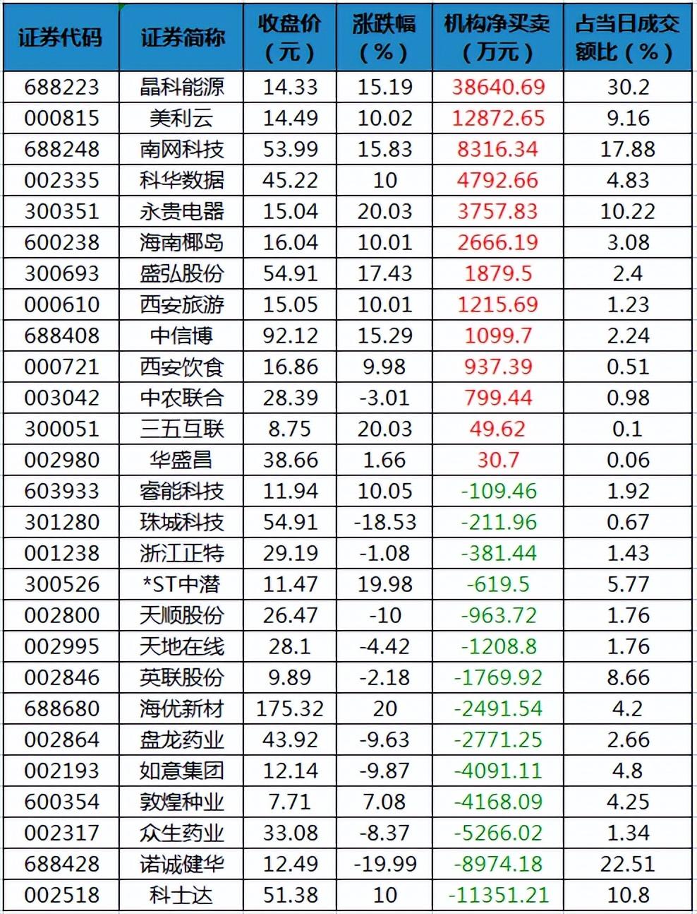 盤后龍虎榜數(shù)據(jù)顯示,周一機(jī)構(gòu)席位資金合計凈買入約3.27億元。其中,凈買入的個股13只,凈賣出的個股14只。機(jī)構(gòu)凈買入多的股票是晶科能源,凈買入金額約3.86億元;機(jī)構(gòu)凈買入居前的還有美利云、南網(wǎng)科技、科華數(shù)據(jù)等股。機(jī)構(gòu)凈賣出多的股票是科士達(dá),凈賣出金額約1.14億元;機(jī)構(gòu)凈賣出居前的還有諾誠健華、眾生藥業(yè)、敦煌種業(yè)等股。
