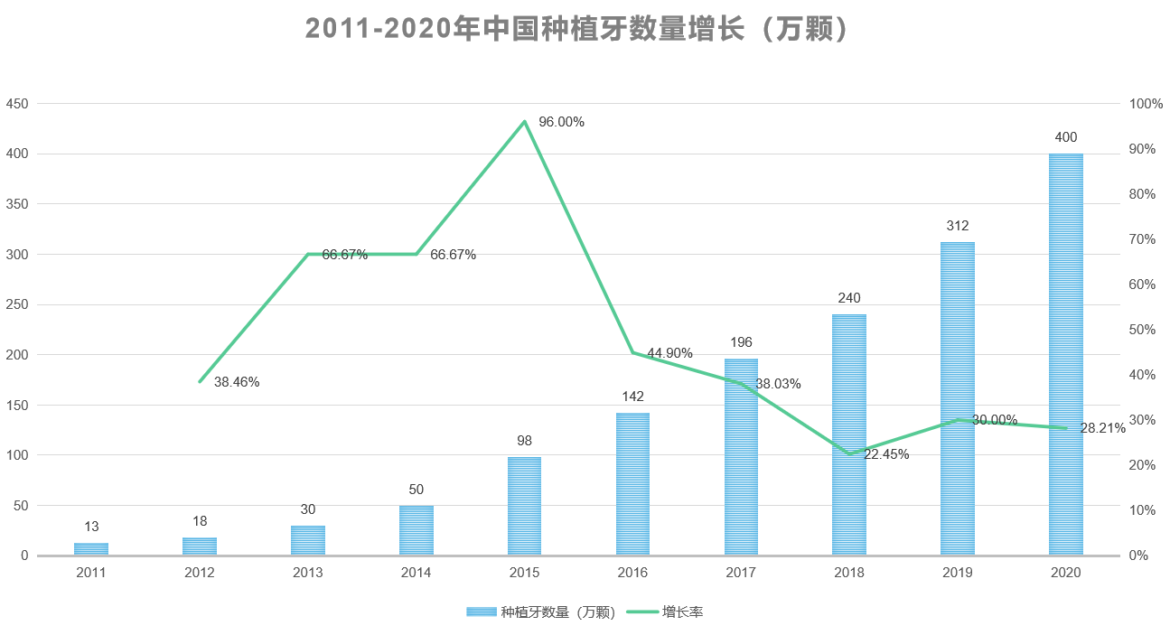 據(jù)中泰證券研報(bào)顯示,2020年我國種植量約400萬顆,換句話說,中國每萬人種植牙數(shù)達(dá)到了28顆。而在此前的10年間,中國種植牙數(shù)量復(fù)合增速達(dá)到了驚人的46%。