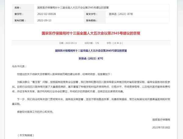 答復(fù)稱(chēng),目前已會(huì)同四川醫(yī)保局開(kāi)展了大量摸底調(diào)研,基本掌握了種植牙耗材臨床使用特點(diǎn)、價(jià)格水平、市場(chǎng)競(jìng)爭(zhēng)格局,以及相關(guān)醫(yī)療服務(wù)收費(fèi)構(gòu)成,并征求有關(guān)專(zhuān)家、醫(yī)療機(jī)構(gòu)和行業(yè)協(xié)會(huì)的意見(jiàn),形成初步的思路和方案,目前正在加緊修改完善。
