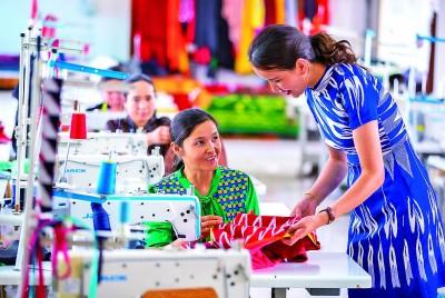 在和田地區(qū)洛浦縣洛浦鎮(zhèn)一家服裝公司內(nèi),負責人阿孜古麗·多來提(右)給員工講解艾德萊斯服裝制衣的技巧。買買提艾力·艾尼瓦爾攝/光明圖片