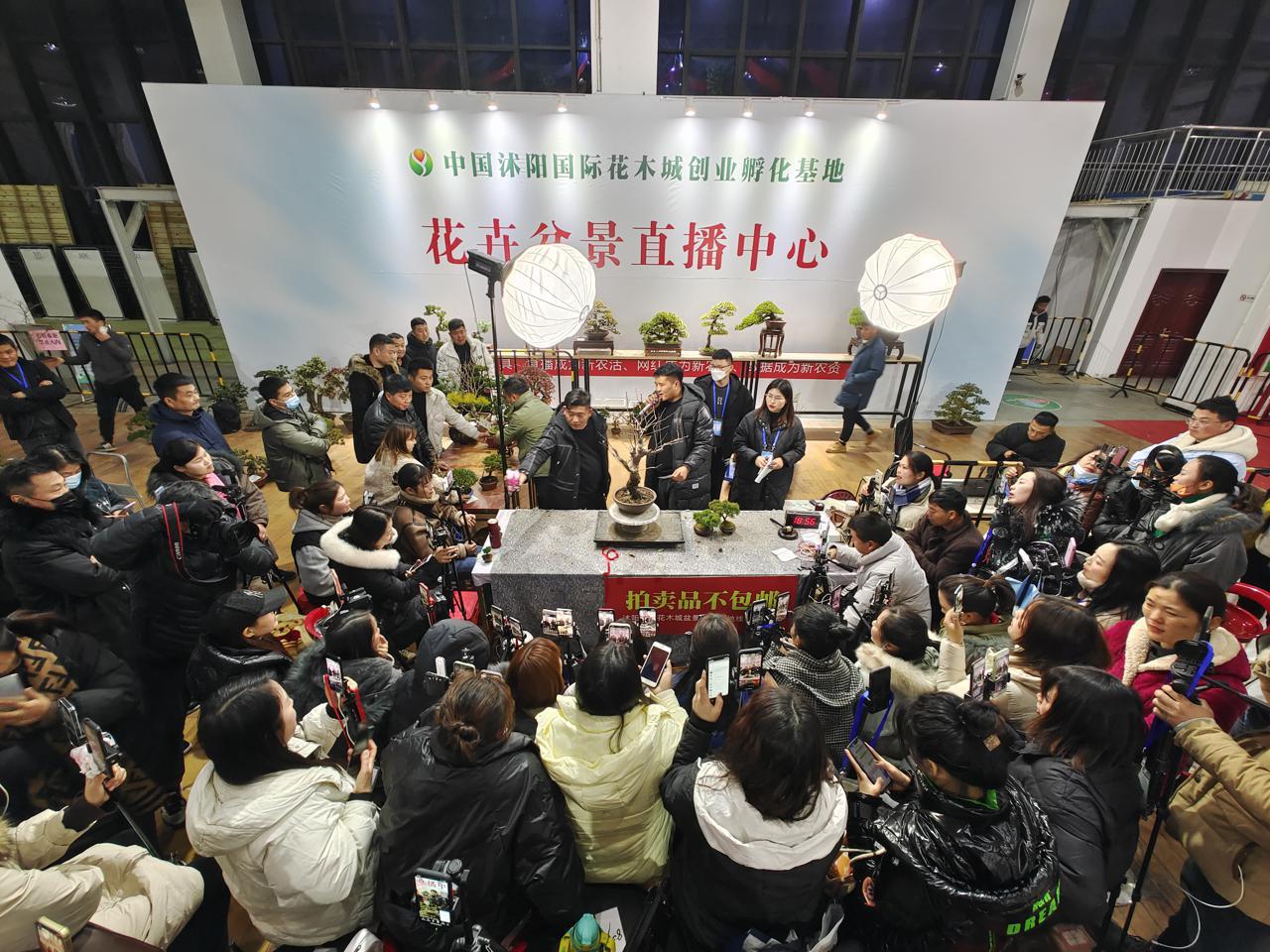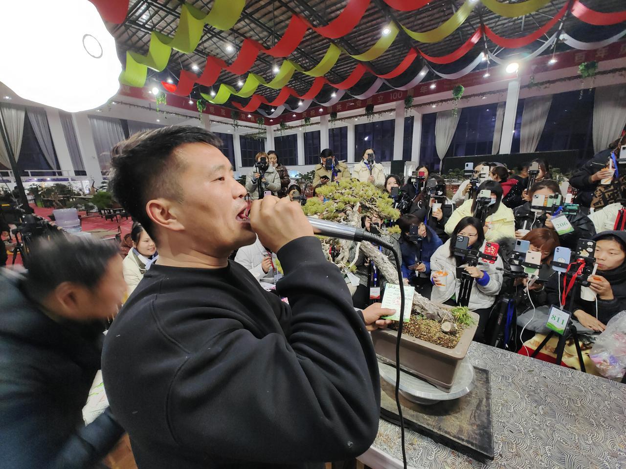 從2021年11月份開始,每天中午12點和晚上6點,這里都會準(zhǔn)時開始兩場拍賣會,上百名當(dāng)?shù)卮迕窦性跁觯ㄟ^直播拍賣的方式,把盆景銷售到全國各地。1月25日晚,記者在現(xiàn)場親身感受到了拍賣會的熱鬧氛圍,現(xiàn)場“漲”聲連連,“錘”聲不斷,持續(xù)4個小時的拍賣會中,主持人輪番上陣,240個盆景銷售一空。