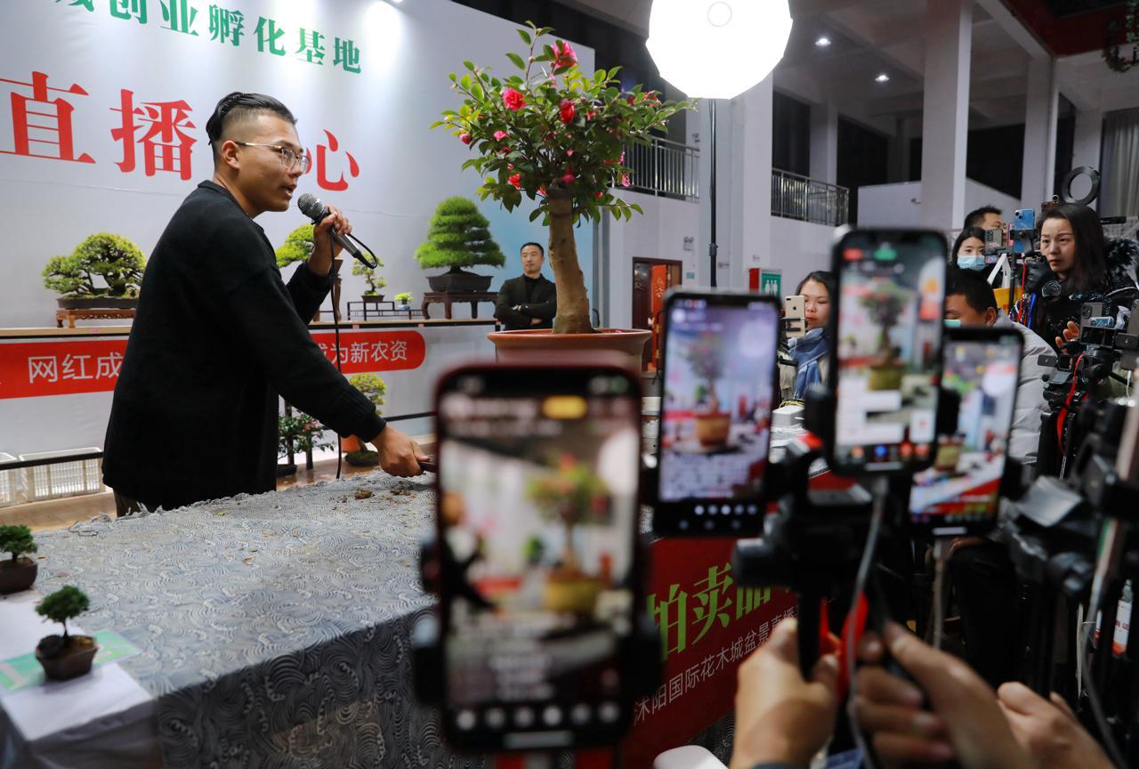 “與一般的直播帶貨不同的是,直播銷售盆景時,直播間里的大多數(shù)觀眾都是行家,主播只有對手上的盆景真正做到了若指掌,客戶才有可能花上萬元甚至數(shù)十萬元來購買?!?3歲的胡康然是這場拍賣會的主持人之一,同時也是當(dāng)?shù)氐牡谌ㄞr(nóng),盡管他自己從事花木電商行業(yè)只有短短兩年,但整個家庭,已有五十多年的花木產(chǎn)業(yè)從業(yè)歷史,因此上手快。