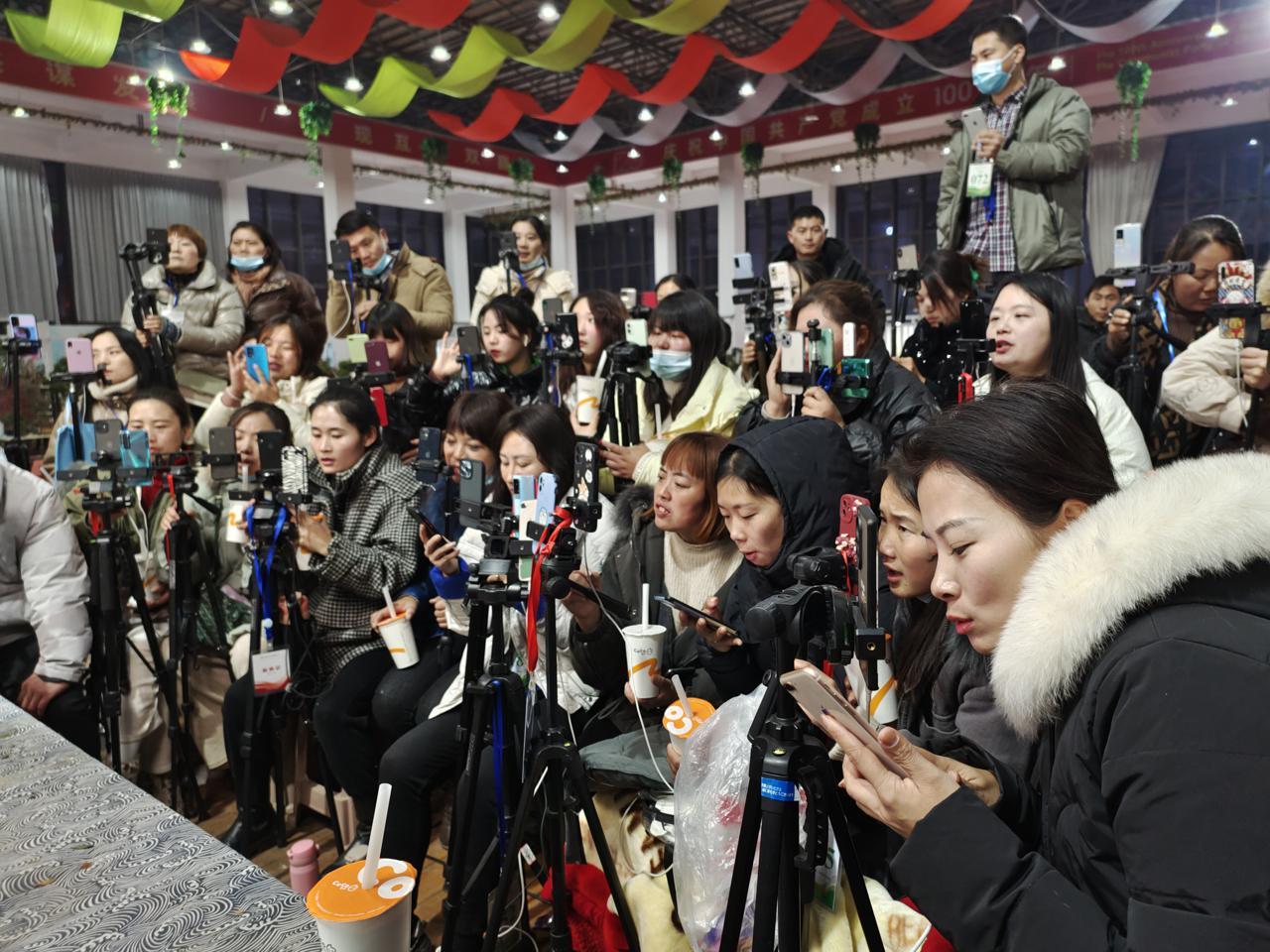 在現(xiàn)場競拍的都是當(dāng)?shù)氐幕ㄞr(nóng),年齡從20出頭到60左右不等,但相同的是,他們每個人的面前都架著兩三部手機,同時在兩至三個平臺直播,不僅現(xiàn)場氣氛熱鬧,直播間里的出價熱情也很高。