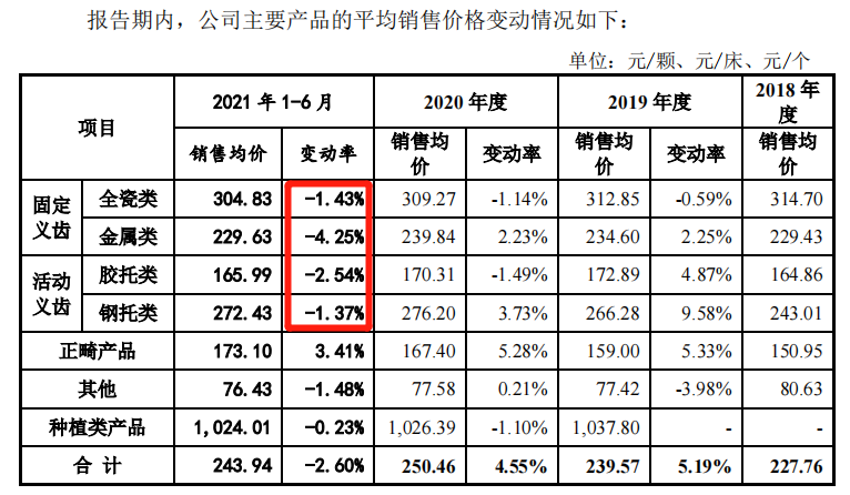 家鴻口腔主要產(chǎn)品的銷售均價(jià)也有所下滑。招股書顯示,2021年上半年,公司固定義齒收入占總營(yíng)業(yè)收入的比例為57.46%,活動(dòng)義齒收入占總營(yíng)業(yè)收入的比例為20.69%。
