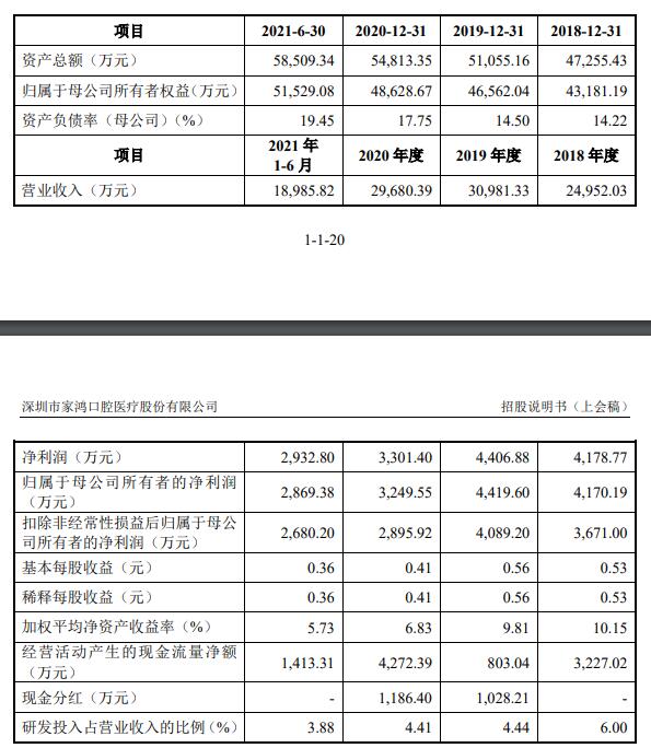 2019年、2020年,家鴻口腔進(jìn)行現(xiàn)金分紅分別為1028.21萬(wàn)元、1186.40萬(wàn)元。