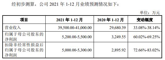 家鴻口腔預(yù)計(jì)2021年1-12月?tīng)I(yíng)業(yè)收入為3.95億元至4.10億元,同比增長(zhǎng)33.08%至38.14%;預(yù)計(jì)歸屬于母公司股東的凈利潤(rùn)為5200.00萬(wàn)元至5500.00萬(wàn)元,同比增長(zhǎng)60.02%至69.25%;預(yù)計(jì)扣除非經(jīng)常性損益后歸屬于母公司股東的凈利潤(rùn)為5000.00萬(wàn)元至5300.00萬(wàn)元,同比增長(zhǎng)72.66%至83.02%。