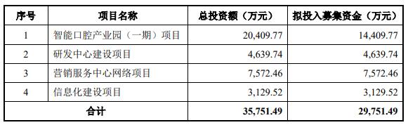 家鴻口腔主要從事固定義齒、活動(dòng)義齒和正畸產(chǎn)品的研發(fā)、生產(chǎn)及銷售,以及口腔修復(fù)類醫(yī)療器械產(chǎn)品經(jīng)營(yíng)銷售等業(yè)務(wù)。公司擬募集資金2.98億元,分別用于智能口腔產(chǎn)業(yè)園(一期)項(xiàng)目、研發(fā)中心建設(shè)項(xiàng)目、營(yíng)銷服務(wù)中心網(wǎng)絡(luò)項(xiàng)目、信息化建設(shè)項(xiàng)目。