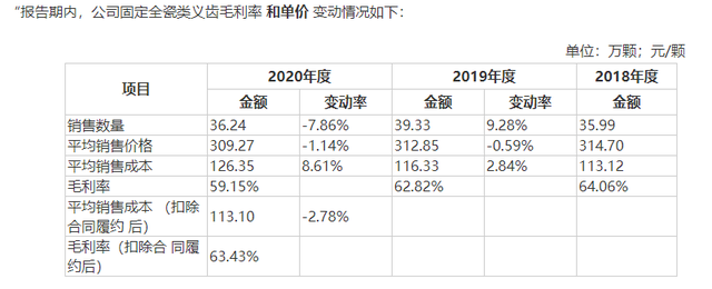 2018-2020年,固定全瓷義齒銷售均價(jià)分別為314.70元/顆、312.85元/顆和309.27元/顆,然而其單位成本分別為113.12元/顆、116.33元/顆和126.35元/顆。也就是說(shuō),一顆假牙的成本也不過(guò)百元,但是種植一顆牙至少花費(fèi)上萬(wàn)元。