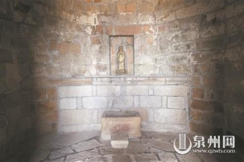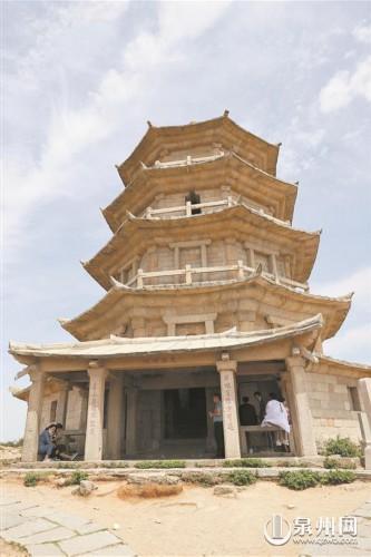 記者從山門遙望頂峰,只見(jiàn)一座石塔巍然矗立仿佛直入云霄,幾段石階開(kāi)鑿于山巖之間,兩側(cè)皆是巖石,頗為陡峭。待攀上山頂,極目遠(yuǎn)眺,便可見(jiàn)遠(yuǎn)處的海灣波光粼粼,四周景色盡收眼底,一覽無(wú)余?;赝f(wàn)壽塔,石塔整體宛若閣樓,由花崗巖筑成,共五層,呈八邊形。一層石門洞開(kāi),兩側(cè)石柱鐫刻有“勝地有緣方可進(jìn) 名山無(wú)福不能游”的對(duì)聯(lián),橫匾即 “泉南勝地”四字。門外還立有幾方石碑,記錄著萬(wàn)壽塔的歷史?!度莞尽酚休d:“關(guān)鎖水口鎮(zhèn)塔也,高出云表,登之可望商舶來(lái)往。”可見(jiàn)萬(wàn)壽塔自古便是重要航標(biāo),亦被稱為關(guān)鎖塔。走進(jìn)塔內(nèi),立即感到一陣清涼舒爽,原來(lái)萬(wàn)壽塔內(nèi)部呈空心樓閣狀,內(nèi)外溫差頗大,是天然的避暑勝地。
