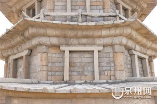 萬(wàn)壽塔與開(kāi)元寺雙塔、六勝塔一樣采用平面八角形設(shè)計(jì),不僅使得看似笨重的花崗巖石組成的形態(tài)顯得勻稱柔美,而且在結(jié)構(gòu)穩(wěn)定性方面得到基本的。為了加強(qiáng)塔體重心的穩(wěn)定性,采取塔身逐層收分和每層門龕錯(cuò)位的做法,使塔身壓力向八個(gè)邊線的垂直面平均分散。