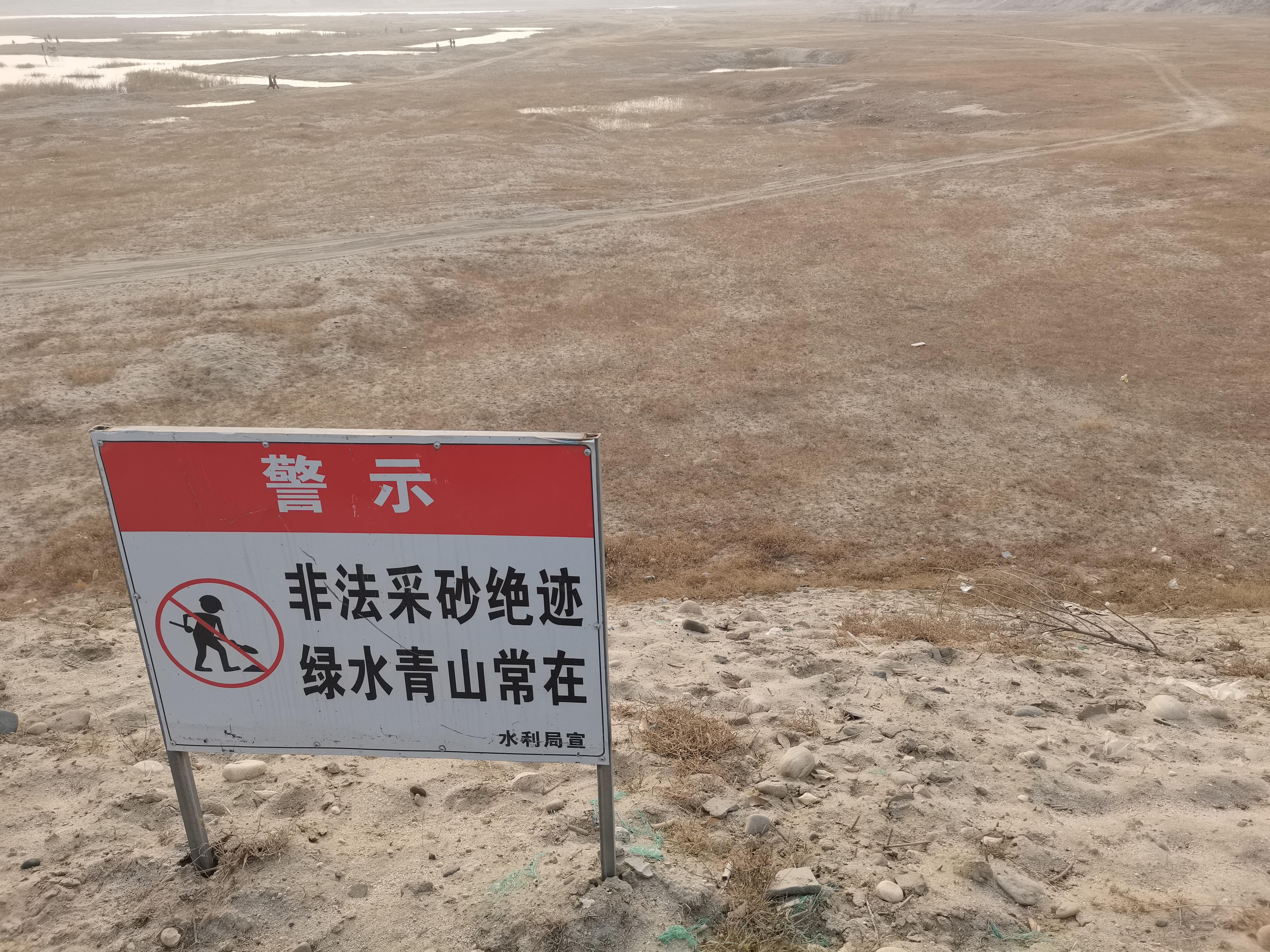 水利部門在砂坑旁樹起“非法采砂絕跡”的警示牌。新京報記者 李英強 攝