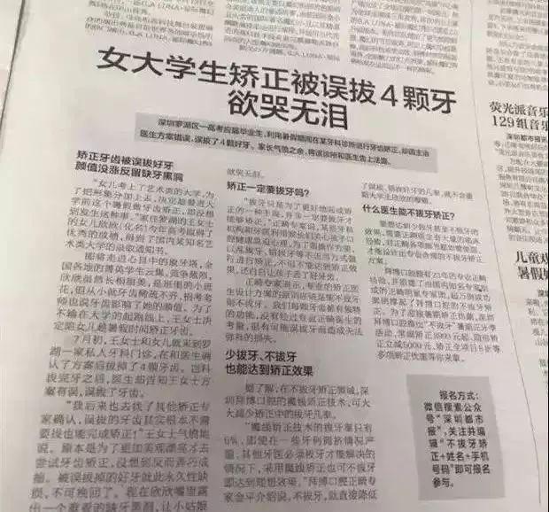 某牙科在報(bào)上刊登文章:一位女同學(xué)在公立醫(yī)院通過(guò)拔牙矯正牙齒,某牙科專(zhuān)家告訴她:“你被誤拔了!”因?yàn)槟硨?zhuān)家有牛逼技能—不拔牙矯正魔線(xiàn)技術(shù)。所以奉勸各位患者都來(lái)某牙科調(diào)節(jié),其他地方的牙醫(yī)都是忽悠人的。