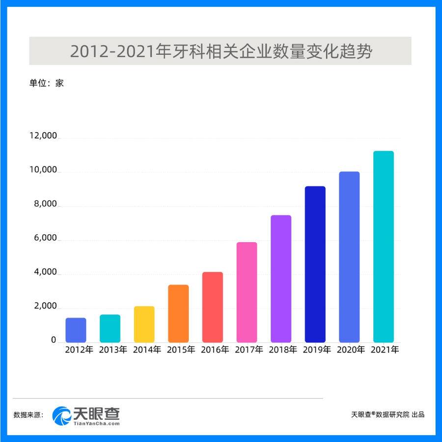 天眼查數(shù)據顯示,截至目前,我國擁有6.7萬余家牙科相關企業(yè)。其中,2021年新增注冊企業(yè)1.1萬家,增速達21.1%。